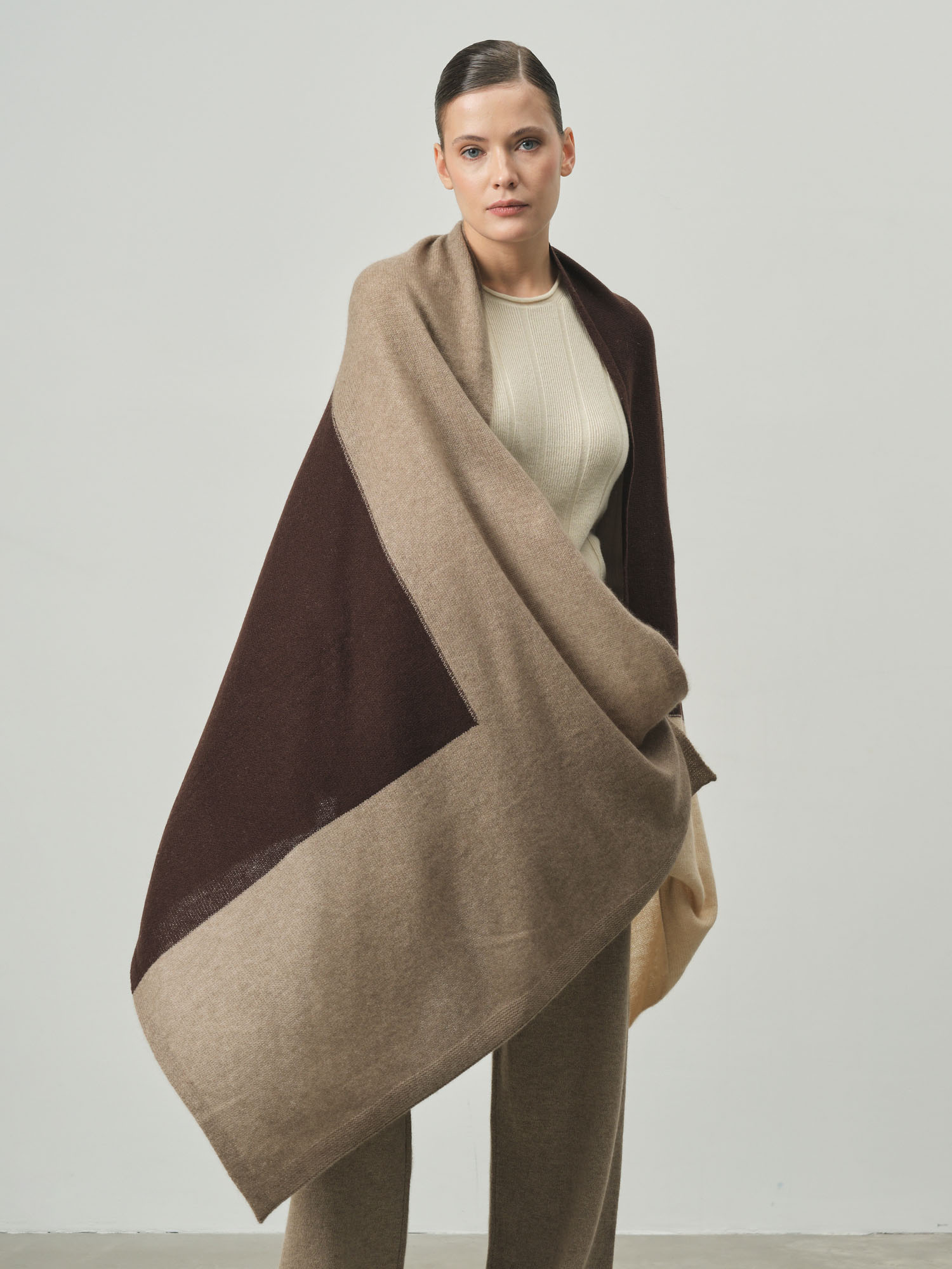 Роскошный палантин! 100% кашемир сразу чувствуется - невероятно мягкий и нежный. Шоколадный цвет просто восхитительный, очень благородный оттенок. Можно носить как шарф или накидку. |
