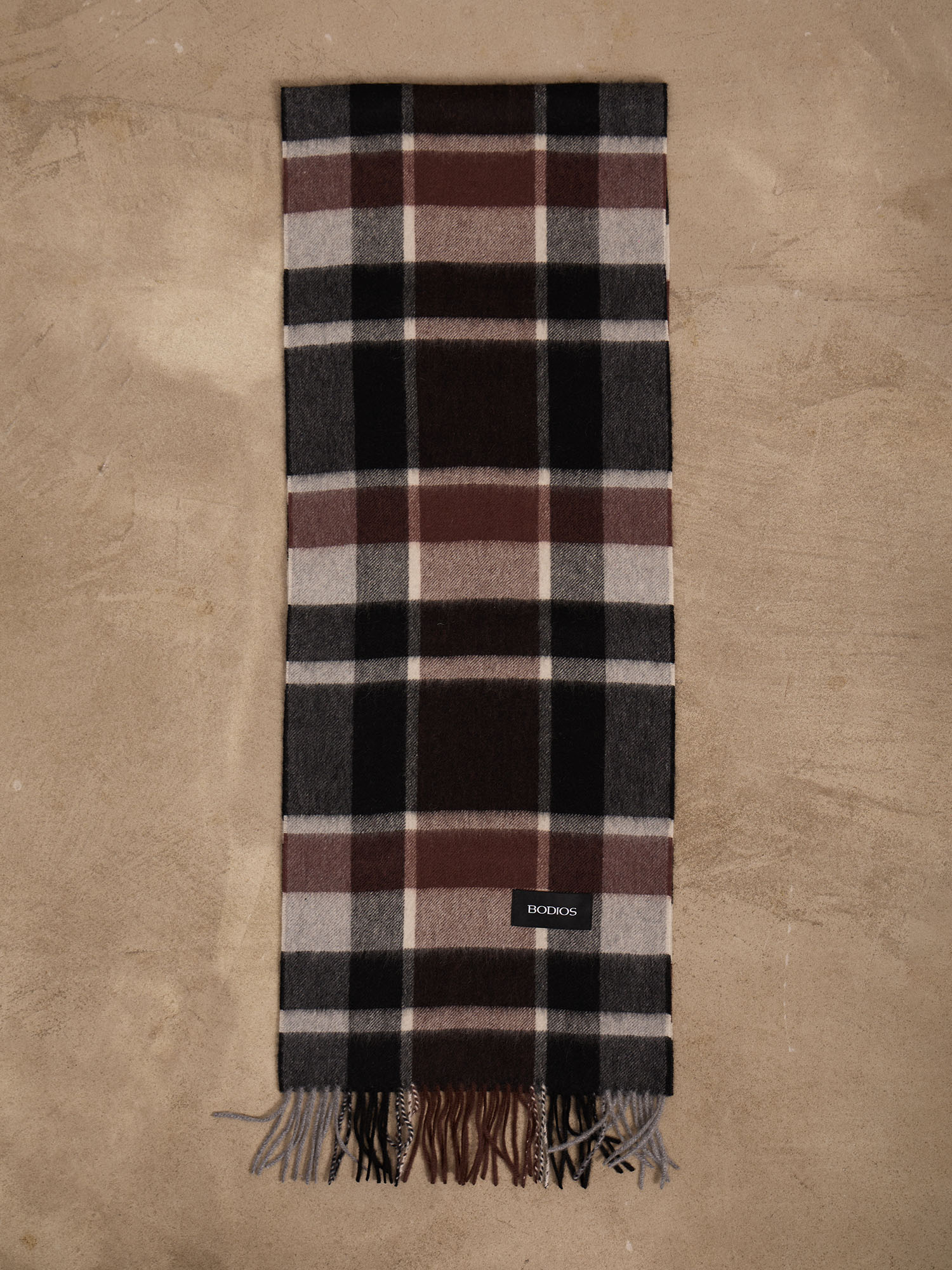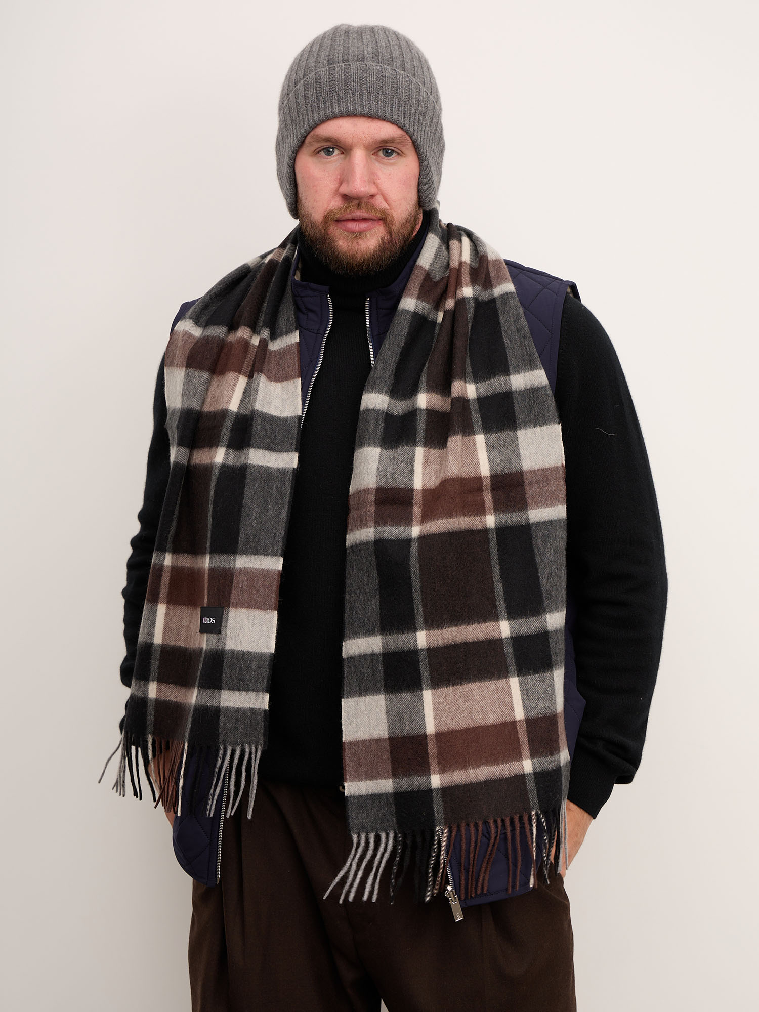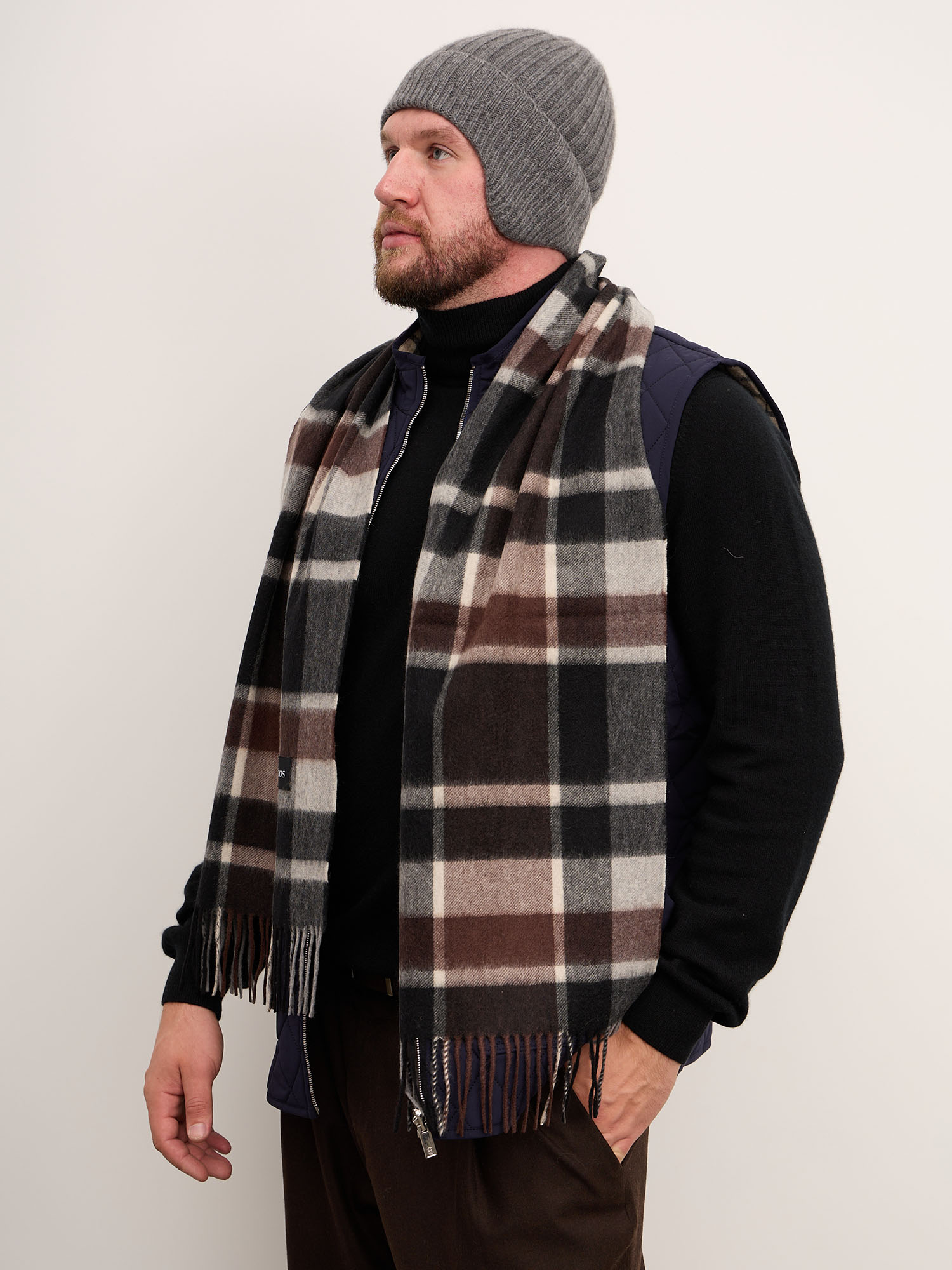 Черный тканый кашемир — это синоним вечной элегантности. В отличие от вязаных аналогов, тканая технология обеспечивает особую плотность и структуру, которые идеально подходят для глубокого черного цвета. Шарф не теряет форму, не вытягивается и сохраняет свой насыщенный цвет годами. Это тот аксессуар, который будет работать в вашем гардеробе всегда — от деловых встреч до неформальных прогулок.