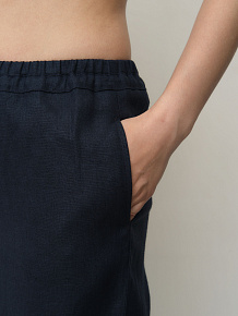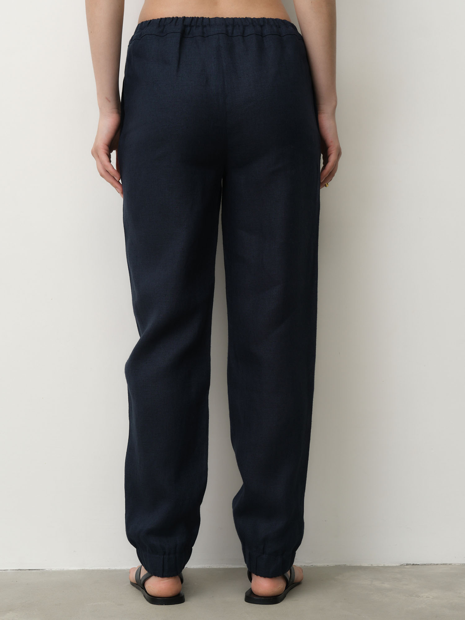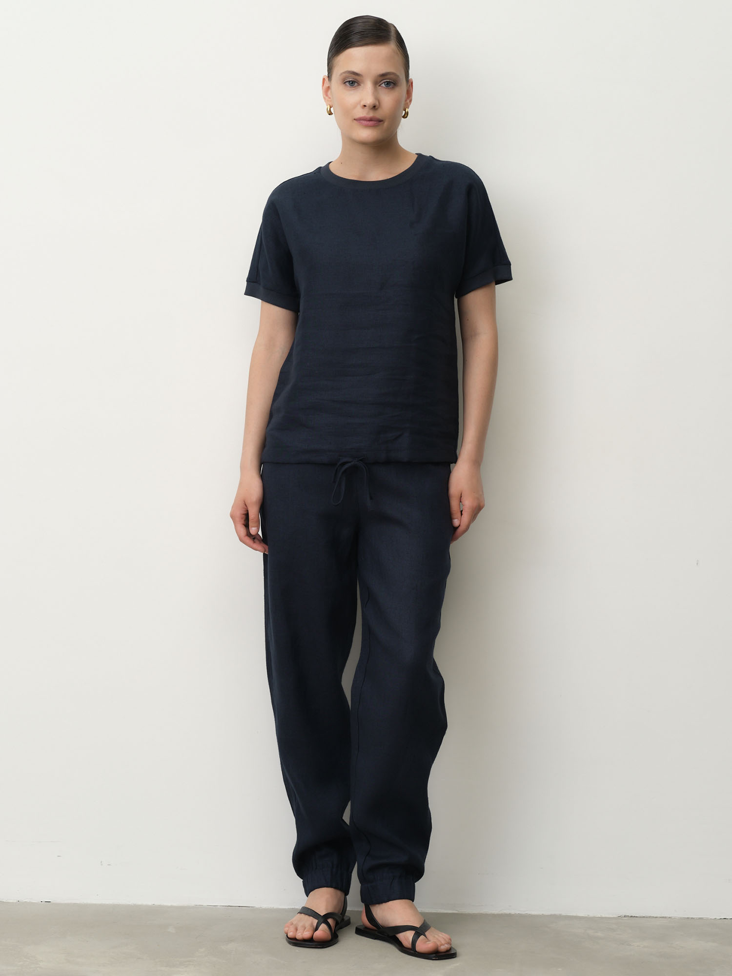 Стильные и практичные брюки из 100% натурального льна в благородном тёмно-синем оттенке — универсальный элемент летнего и демисезонного гардероба. Натуральный состав гарантирует комфорт в течение всего дня, а глубокий цвет делает модель актуальной как для повседневных, так и для офисных образов. Ткань приятная к телу, дышащая, с характерной льняной фактурой. Брюки легко сочетаются с любой базовой одеждой и подходят для образов в стиле casual, smart или минимализм.