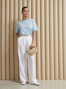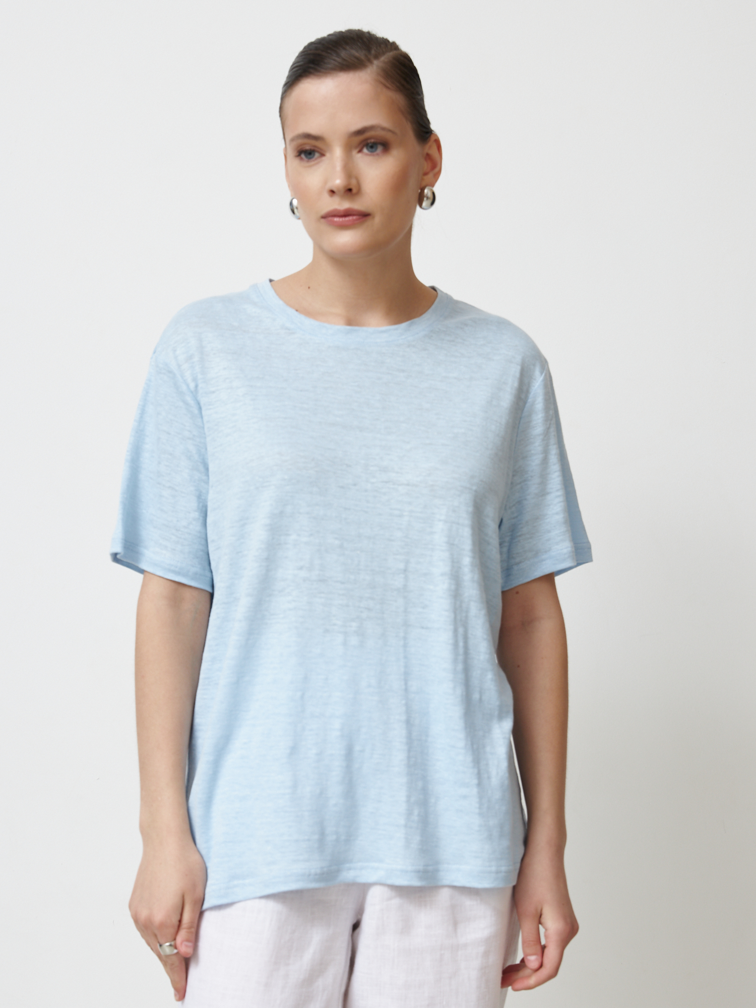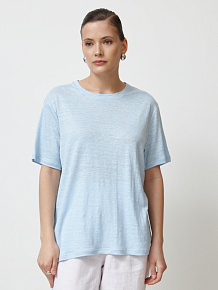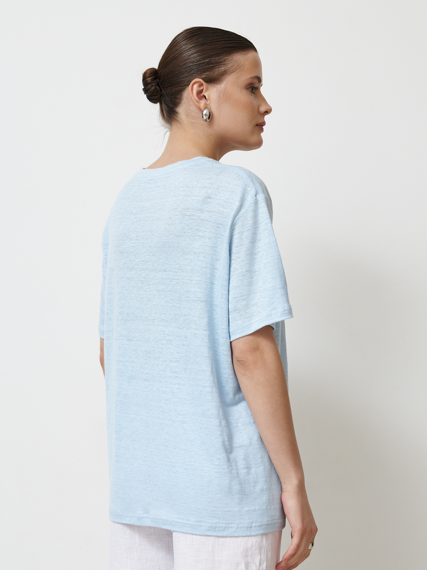 Футболка из конопли — идеальный выбор экостиля. Голубой оттенок живой, сочетается с любыми брюками. |