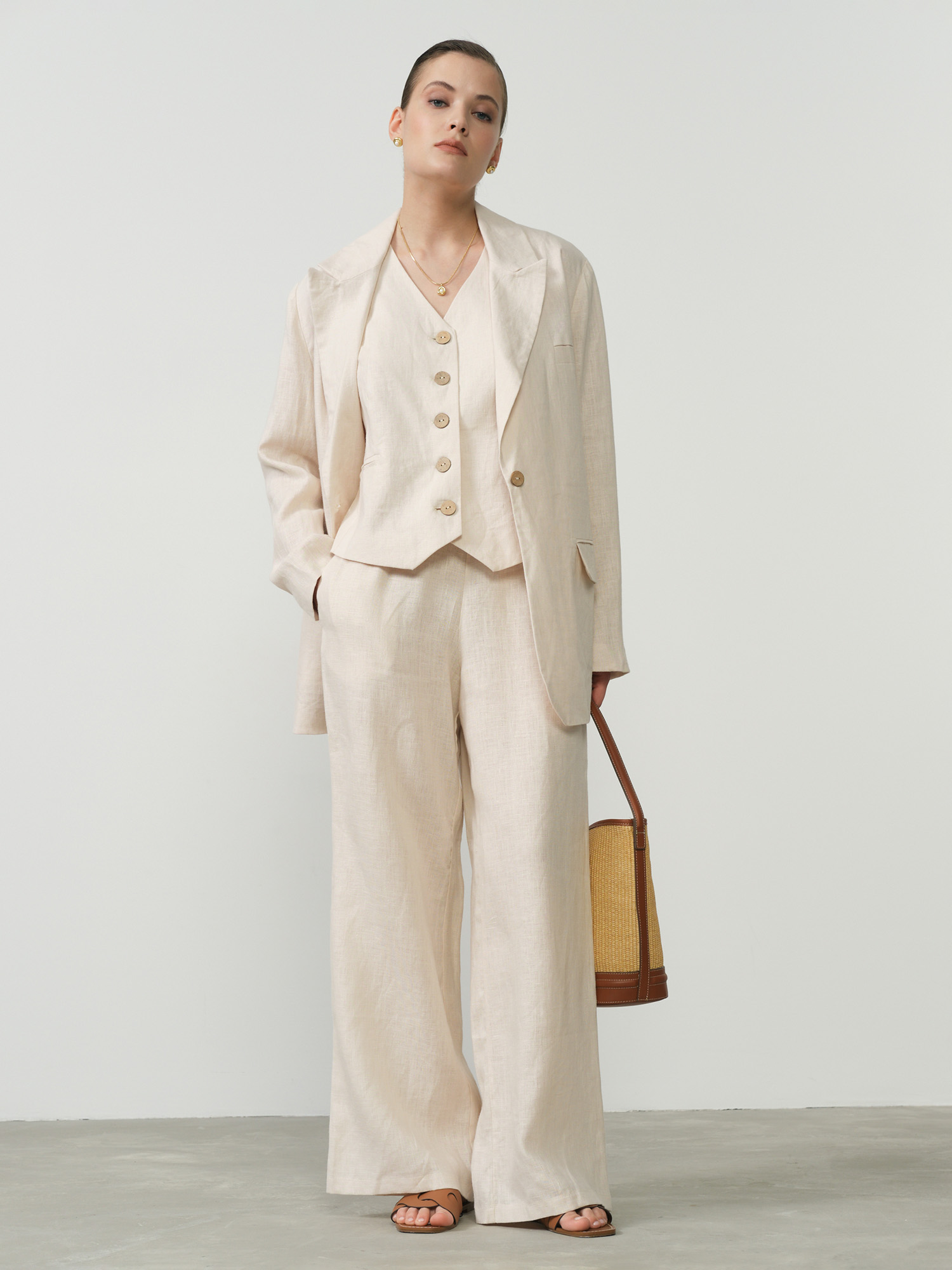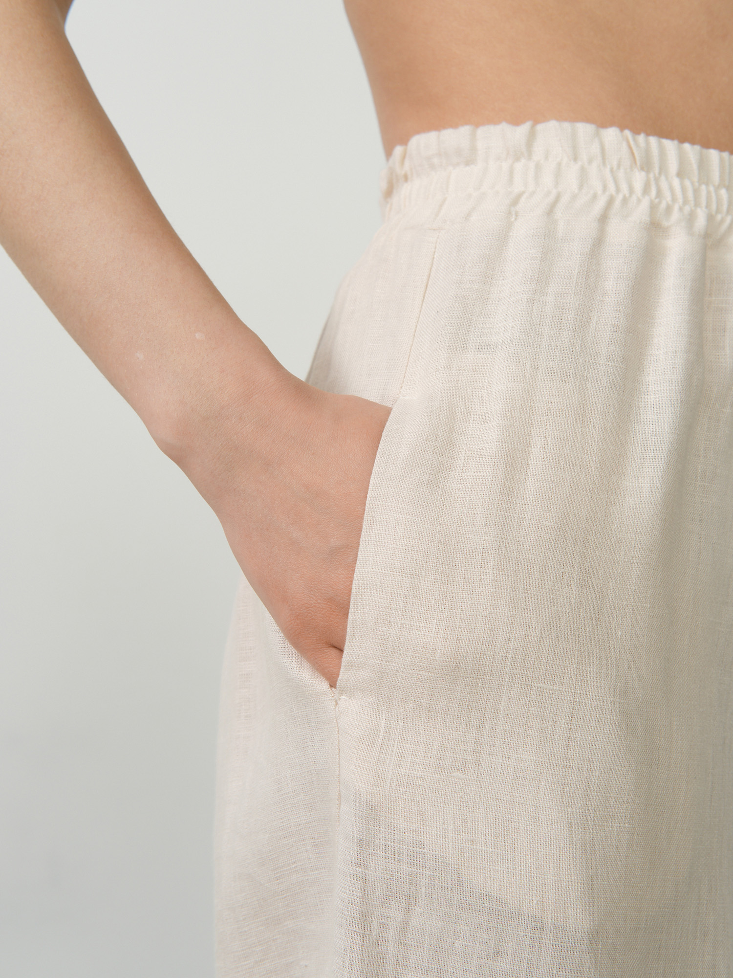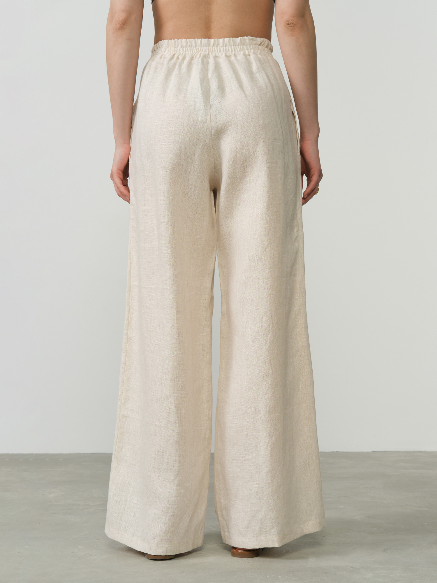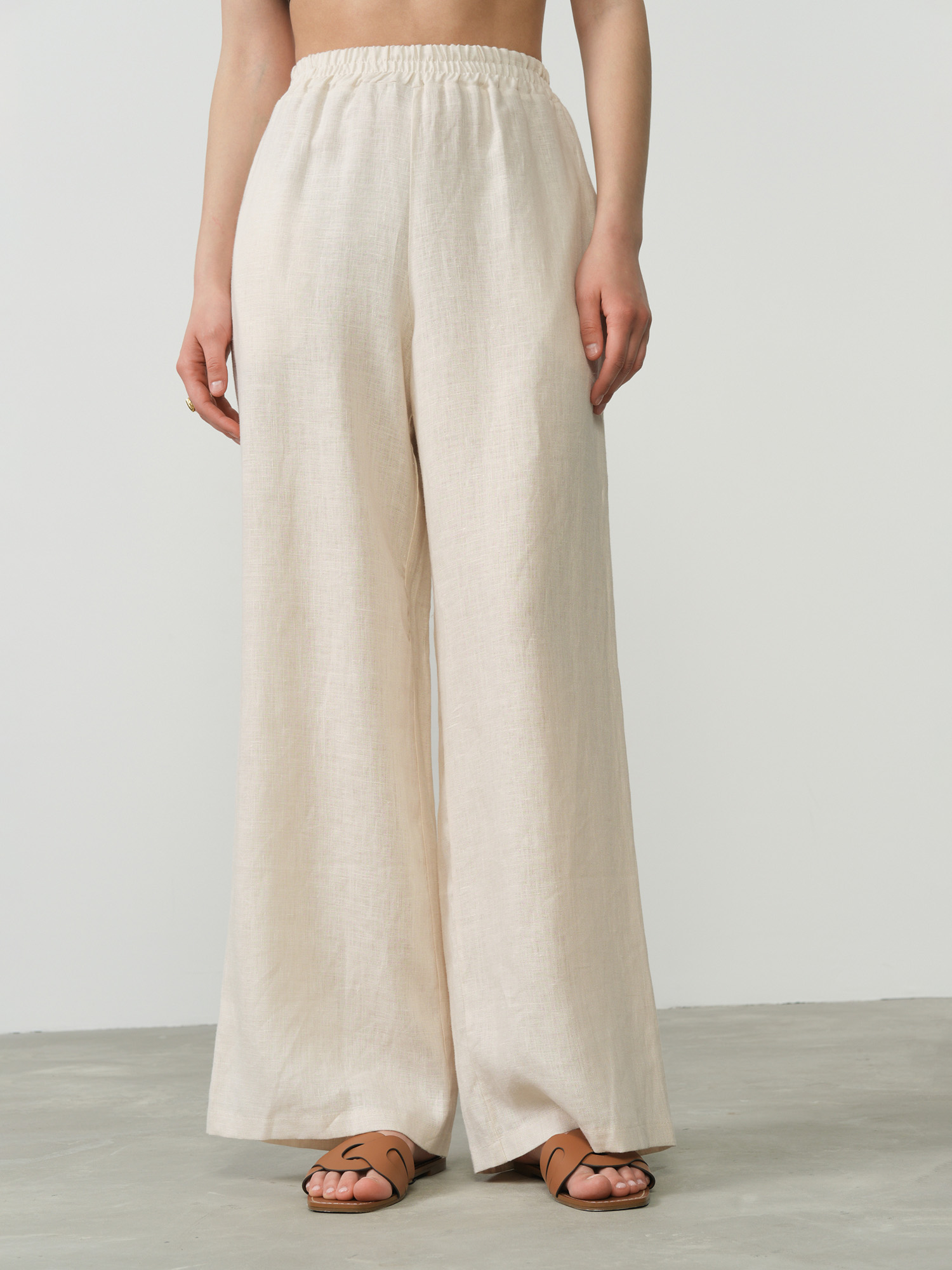 Бежевый цвет делает эти брюки универсальными, позволяя легко сочетать их с различными топами и аксессуарами для создания элегантных повседневных образов. Прямой силуэт и минималистичный дизайн подчеркивают естественную красоту ткани и придают образу легкость и женственность.