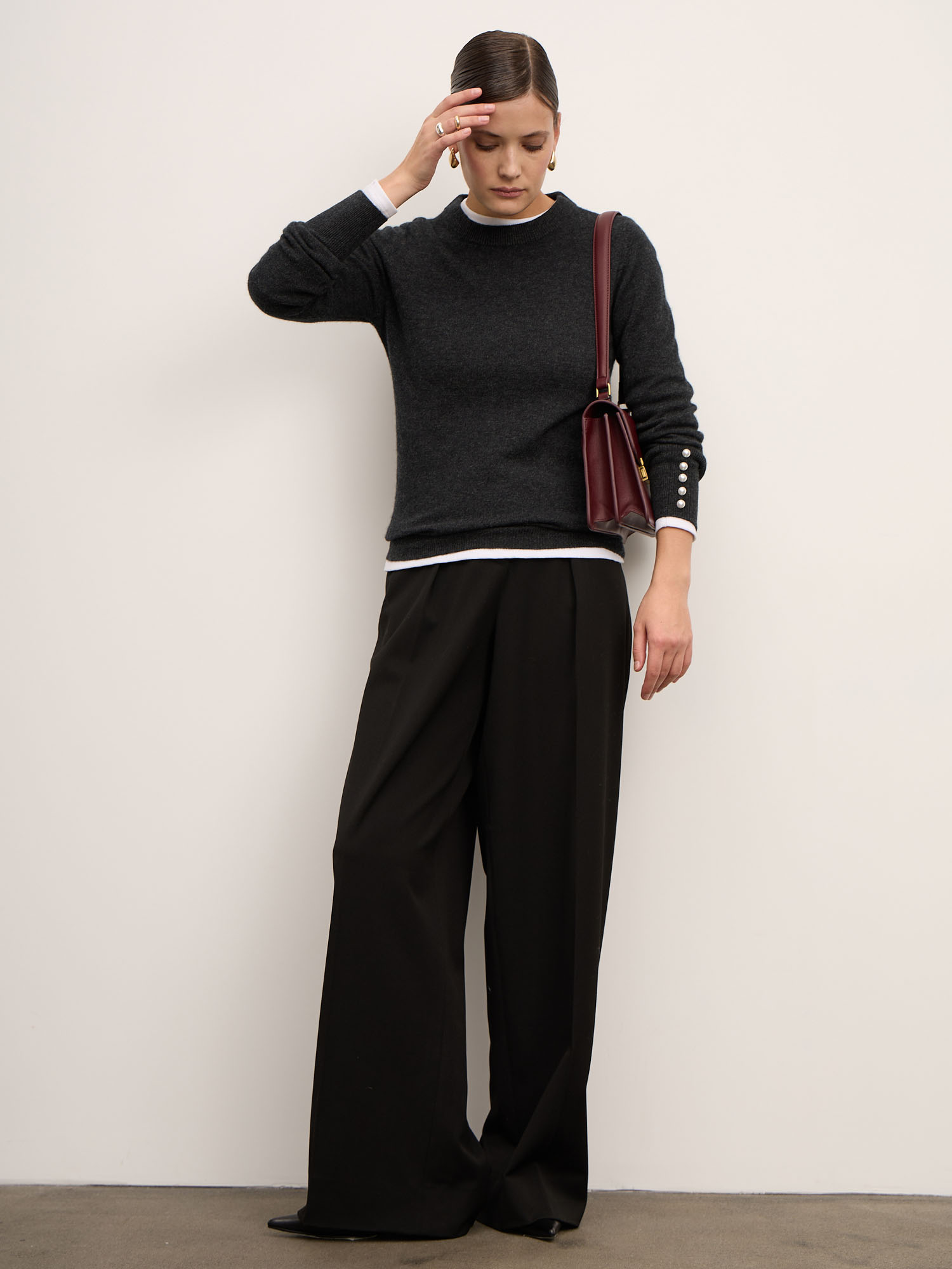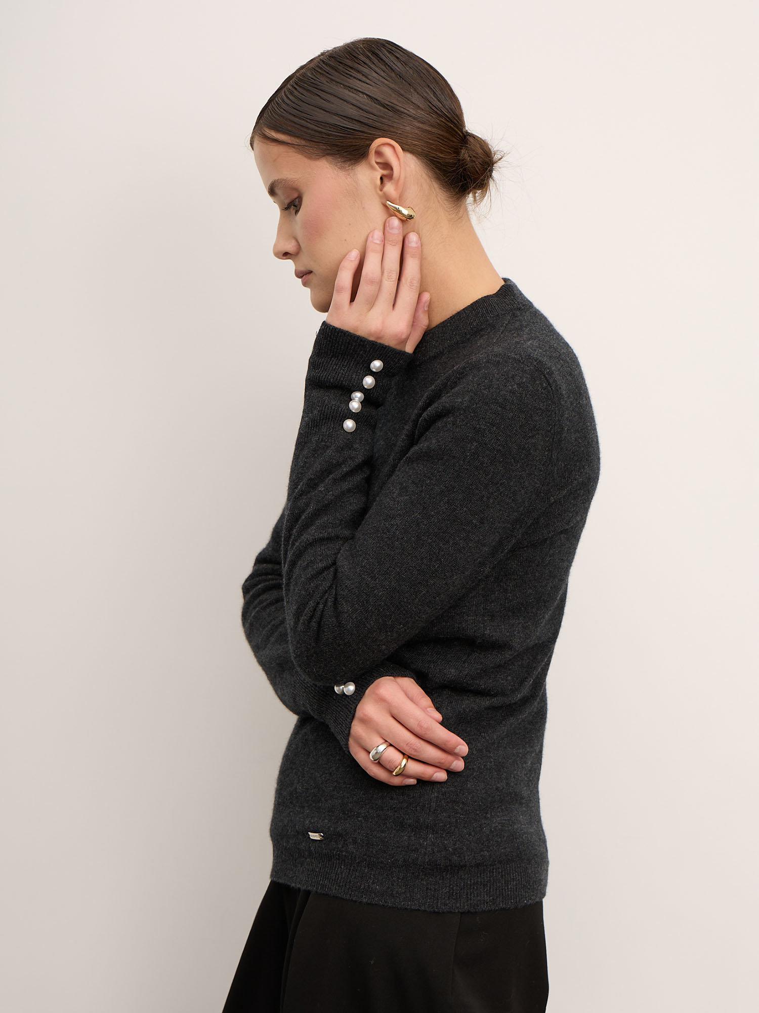 Джемпер выполнен в минималистичном крое с округлым вырезом и длинными рукавами. Акцент — изысканные декоративные пуговицы на манжетах, которые добавляют образу изящность и индивидуальность. Манжеты и нижняя резинка держат форму и подчёркивают аккуратную посадку изделия.