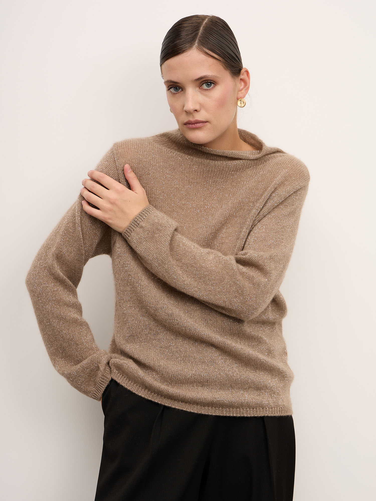 Джемпер из кашемира с добавлением люрекса — это мягкость, тепло и едва заметное сияние, которое делает повседневный образ особенным.
