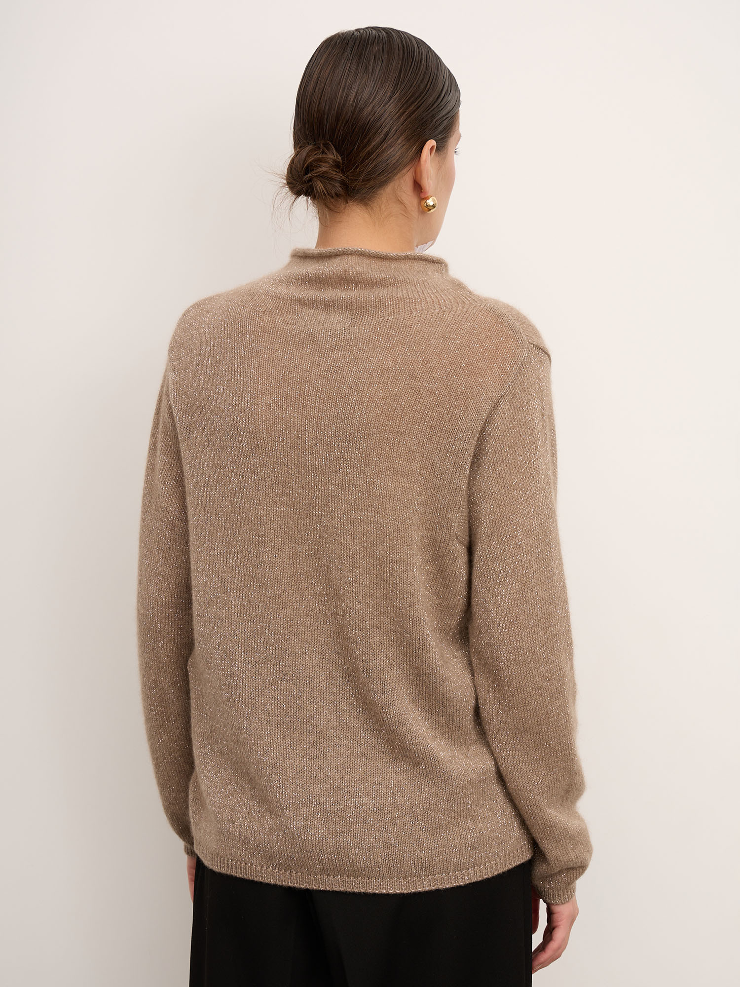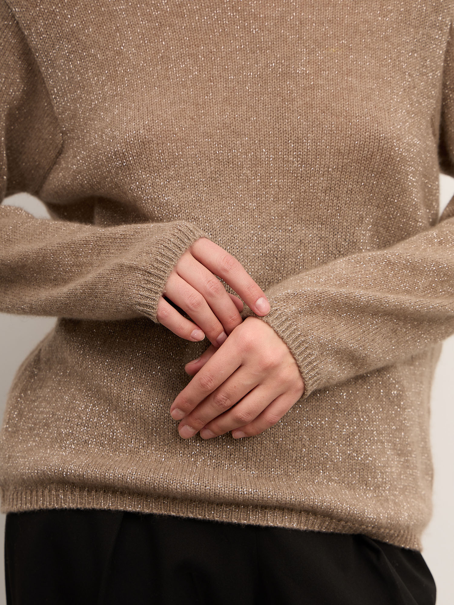 Лёгкий блеск люрекса делает джемпер особенно выразительным при мягком освещении, добавляя образу изысканности и лёгкого праздничного настроения.