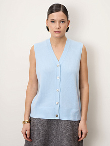 Модель выполнена в виде лёгкого вязаного жилета с V-образным вырезом и застёжкой на аккуратные пуговицы. Гладкая вязка подчёркивает благородную текстуру кашемира. Минималистичный дизайн делает изделие универсальным и элегантным.