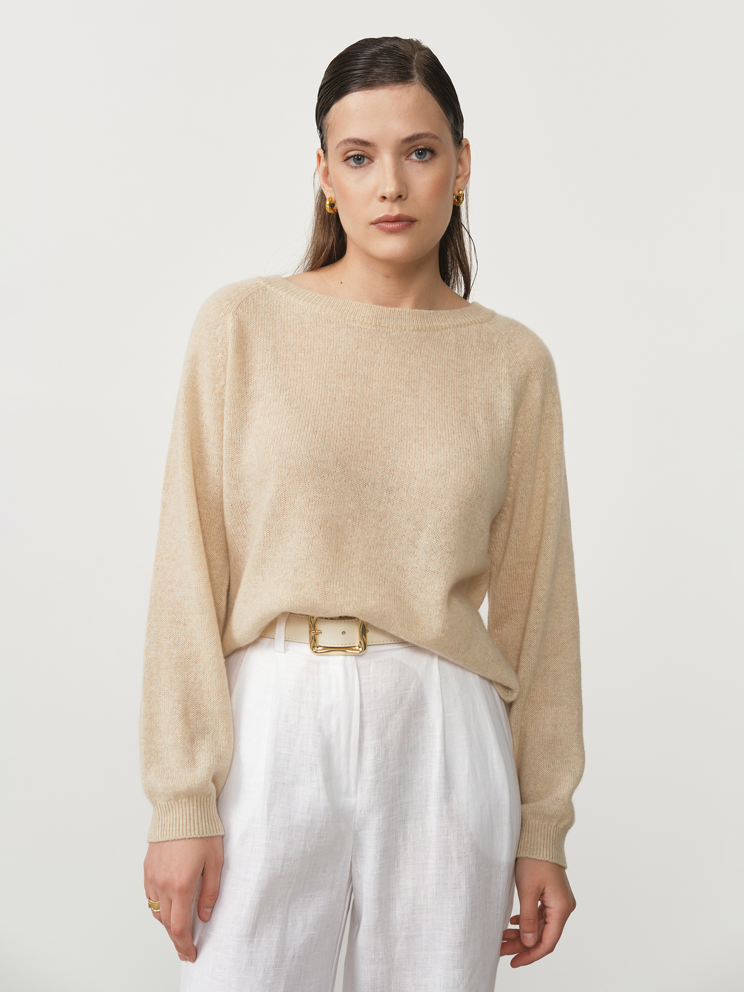 Классический крой с круглой горловиной обеспечивает идеальную посадку по фигуре, не стесняя движений. Безупречная, равномерная вязка создает эффект шелковистой гладкости и подчеркивает премиальный характер изделия. Бежевый оттенок — воплощение тонкого вкуса и элегантности, легко интегрируется в любой гардероб и стилистические направления.