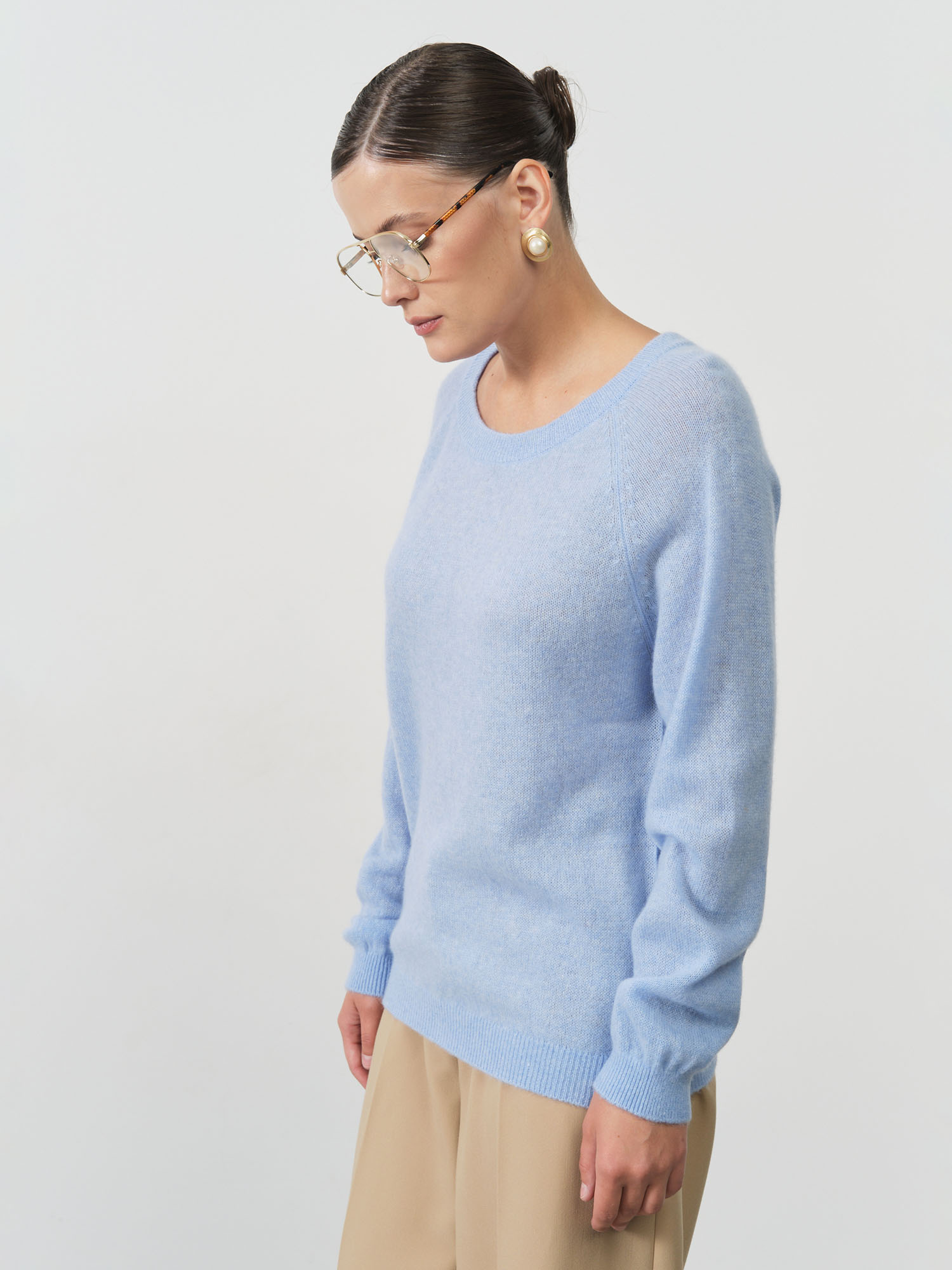 Классический крой с круглым вырезом создает утонченный силуэт, подчеркивающий женственность и естественную грацию. Свободный, но не объемный фасон подходит для любого типа фигуры и обеспечивает свободу движений. Голубой цвет придает образу свежесть и легкость, гармонично сочетаясь как с деловыми нарядами, так и с повседневными комплектами.